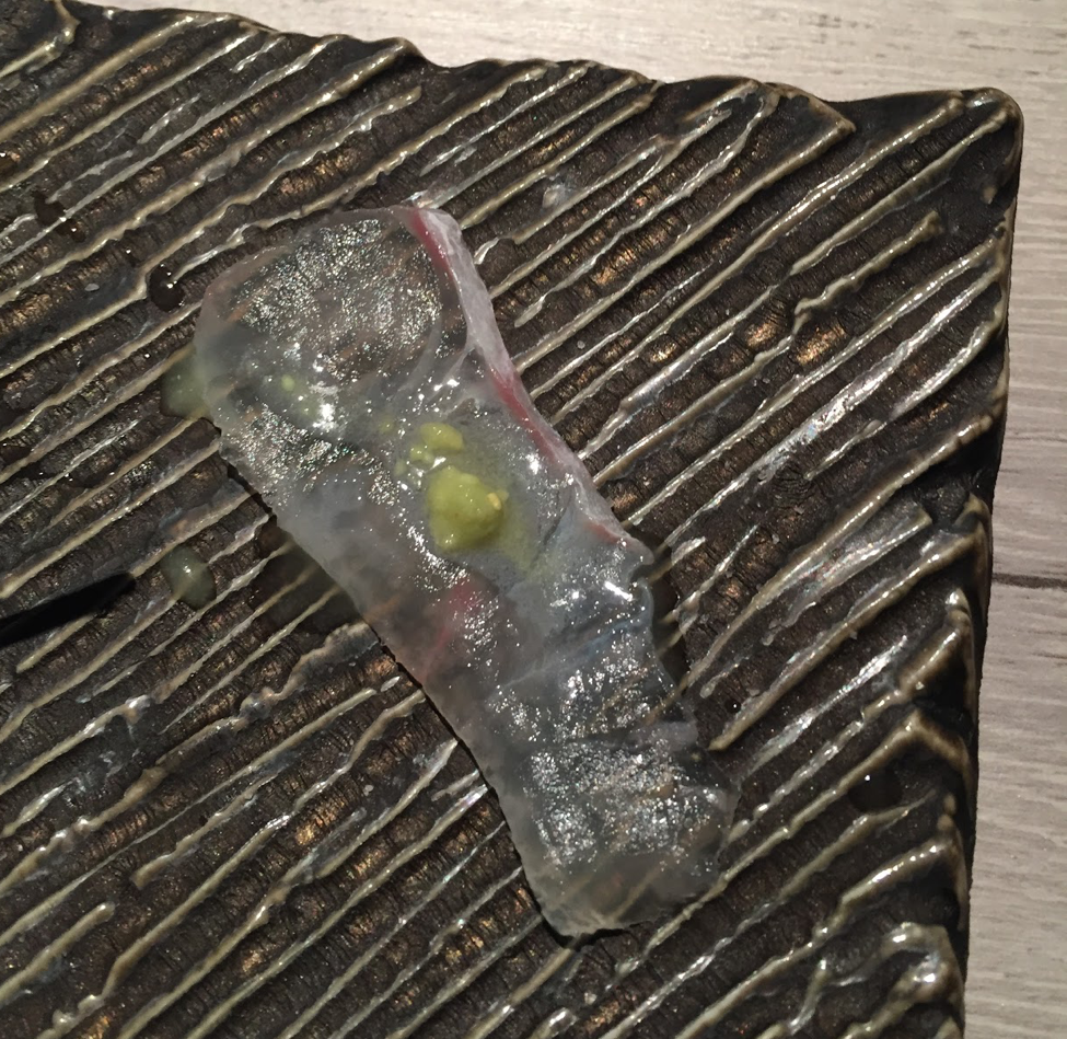 Our first 2 dishes were our appetizers. The first was a raw seaweed dish that was soaked in a delicious yuzu sauce, which whetted our appetites. The second dish comprised three, raw octopus slices with different sauces on them. The second slice of octopus had a yuzu sauce on it, which was refreshing. The last slice of octopus had a spicy sauce on it that really had a nice kick to it. It was our favorite. Before this dish, we had never had raw octopus before. After eating this dish, we were completely sold that this Omakase experience was going to continue to be an amazing one. The appetizers were followed by the sashimi and sushi courses. Before the sashimi course, we were served one slice of extremely fresh fish (it might have been Hamachi). The server explained that the fish was still alive that morning, and that the clear flesh was an indication of how fresh the fish is.