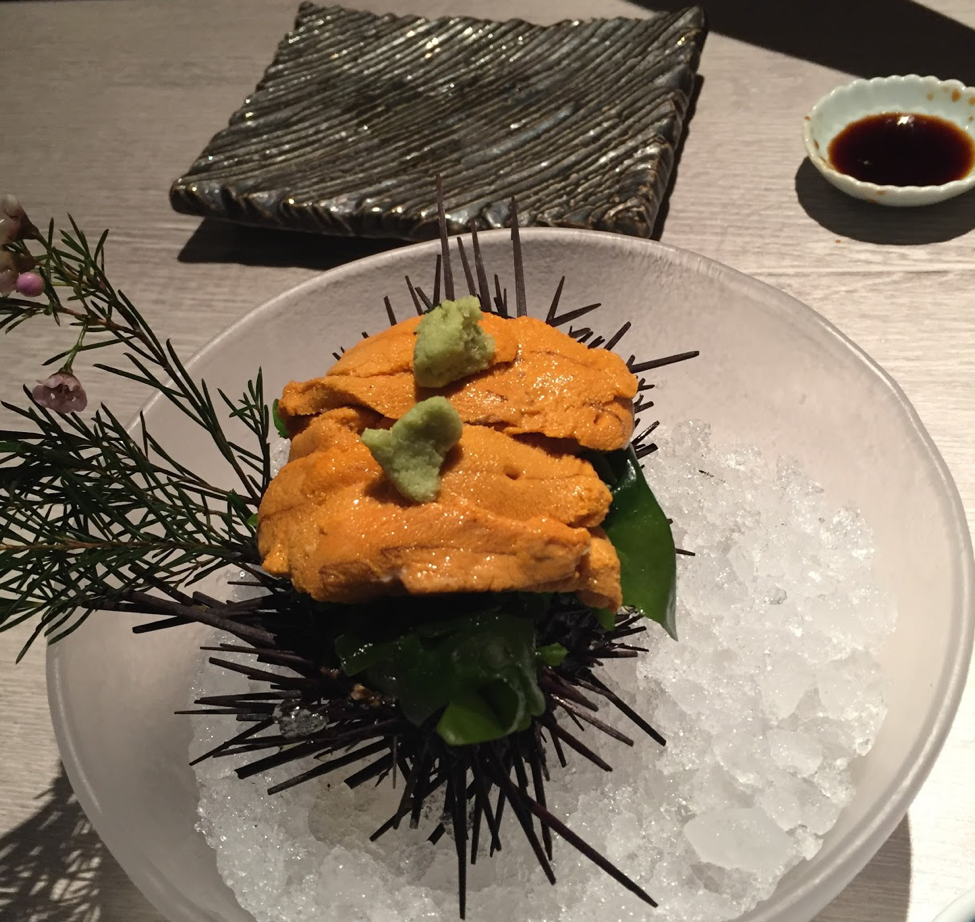The sashimi course had a nice, fatty piece of toro Bluefin tuna, which was our favorite. The sashimi course also included a shrimp’s head as part of the presentation. Upon completion of the sashimi course, the servers asked us how we would like our shrimp heads to be prepared as one of our dishes later in the Omakase experience. I chose to have mine prepared in a soup, while he chose to have his deep fried! We loved all 3 pieces of sushi that we had. We were also served uni, which is sea-urchin, raw, and on its own.