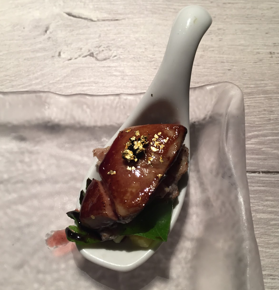This dish was one of my absolute favorites. I was blown away with how the different tastes and textures were encompassed with all that were served on this little spoon. The top layer is creamy piece of foie gras (duck liver), followed by a juicy, tender piece of Kobe beef, supported by various vegetables that added those nice crunchy textures to round out the textures of the foie gras and Kobe beef. This was like a party in my mouth! He had never eaten foie gras before today, as he is a little queasy about “weird food” like livers. However, he was very pleasantly surprised with this dish, although I think I liked it more than he did.